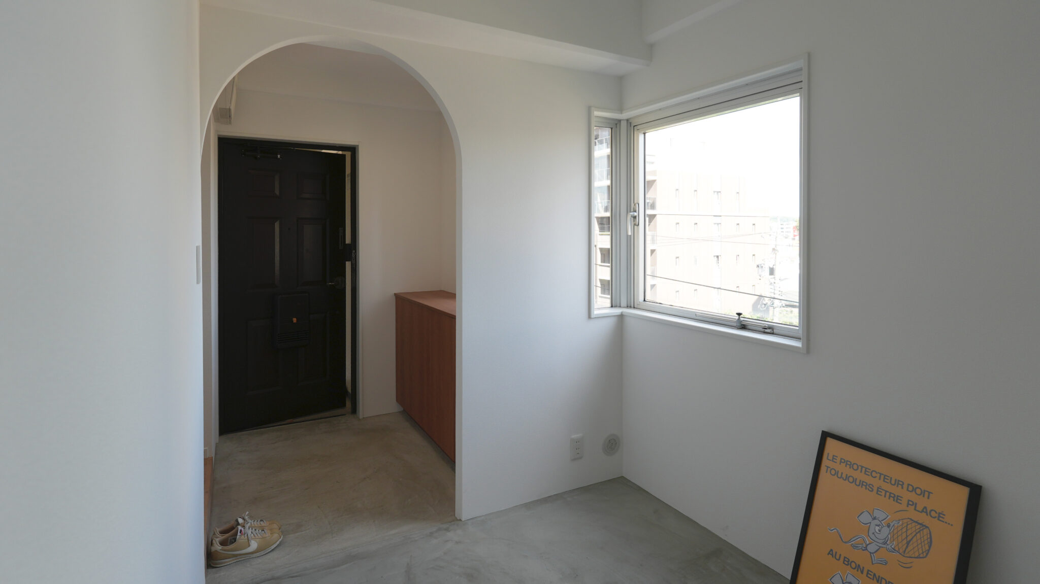 玄関からアーチ型開口を通してアトリエを見通せる設計。空間の連続性が生まれ、帰宅時の心地よさを演出します。